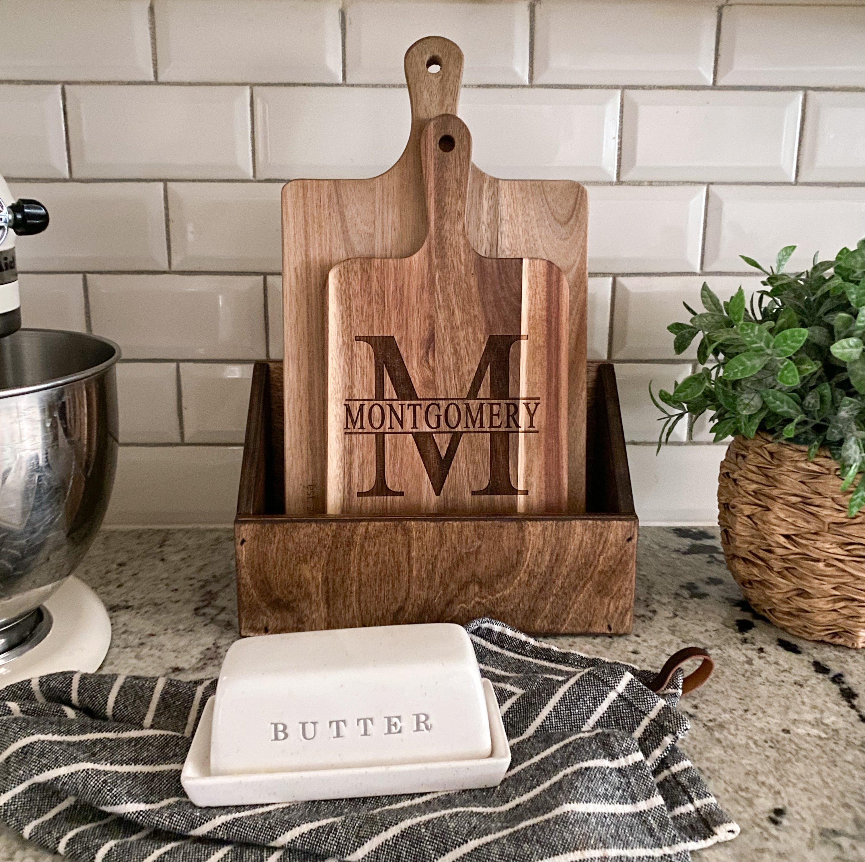 A handcrafted holder designed to organize cutting boards neatly while keeping them upright, accessible, and off your counters.