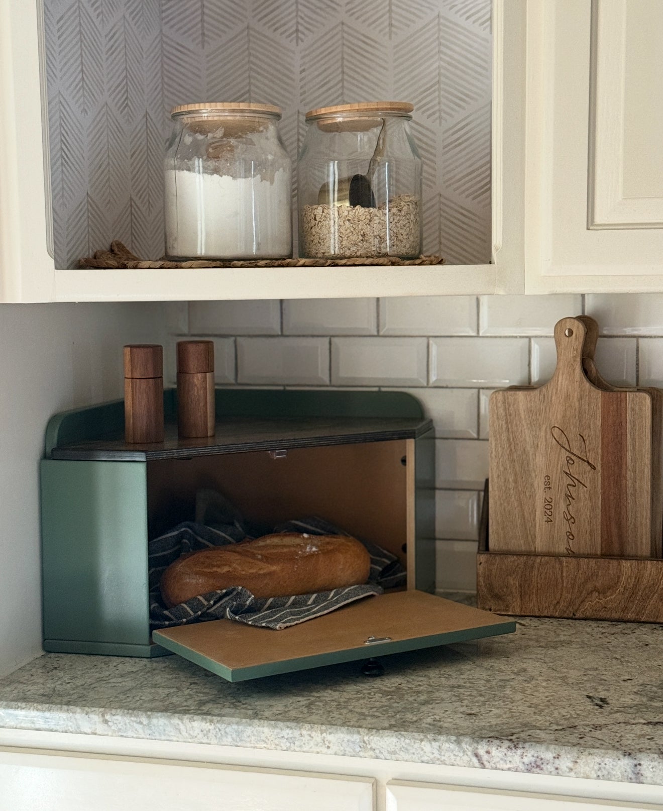 Crafted for the counter, this corner bread box honors the effort that goes into baking bread while keeping it fresh.