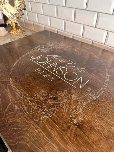This noodle board is laser engraved and the inset is hand painted in soft ivory the board is stained warm brown with a top coat. The flowers are dainty accents.