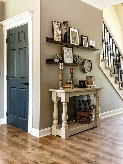 Love your living room! Accent to your space with this farmhouse-style console table. Crafted of solid wood, this console table offers gorgeous, distressed baluster legs made of solid knotty pine and a plank-style tabletop. One open lower plank-style shelf is great for stacking books or storing blankets, while the tabletop provides a perfect platform for framed photos, potted plants, or a stylish pair of lamps. Elegance meets earthy! It is perfect for your entryway, as a sofa table or anywhere you need stylish storage. It is an eye-catching complement to our baluster coffee table and end table. This table works as an entry table, sofa table, or console table.