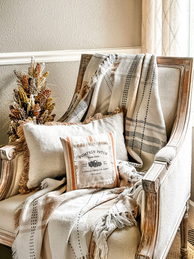 Bring the warmth of Autumn into your home with our Pumpkin Patch Pillow. This farmhouse-inspired throw pillow features a vintage truck and a charming pumpkin patch message. Made with cream and orange striped canvas, it adds a touch of rustic charm. At 10" x 10" x 3.5", it's the perfect addition to your seasonal decor.