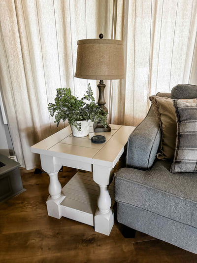 The perfect complement to your elegant yet rustic farmhouse living room. Each and every end table from us is handcrafted from start to finish; painted, fully assembled by us, and built to last. And be sure to check out our matching coffee tables to have the complete set!
