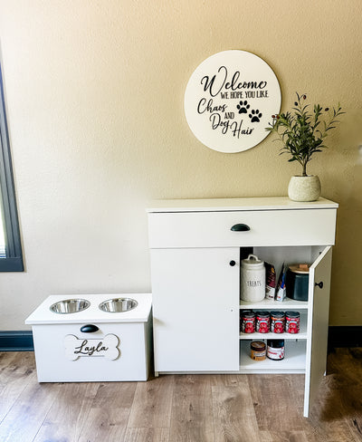 This simple pet food storage offers an aesthetically pleasing way to keep your pet's food hidden from view. It boast 4 shelves, 2 are adjustable, with one fully functioning drawer that’s perfect for leashes, and brushes. Keep you pet area looking clean and tidy.