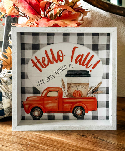 Add a little spice to your fall decor with our Let's Spice Things Up Framed Sign! Made of wood, this sign features a charming watercolor illustration of a vintage truck carrying a pumpkin spice coffee cup, set against a gray and white buffalo check background. The sign reads "Hello Fall! Let's Spice things up" in bold text, and is framed in weathered white for a rustic touch. Measuring 7.75" high by 7.75" wide by 1.5" deep, it's the perfect addition to any fall display.