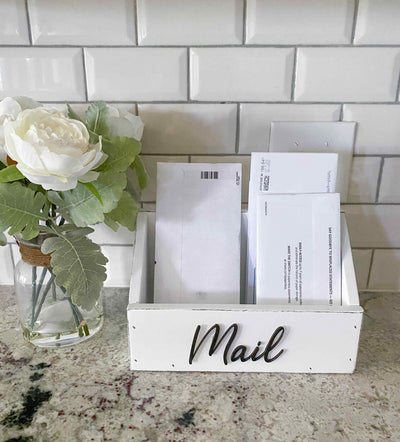 Tame the daily paper pile with our handcrafted wooden mail caddy—an attractive and practical solution for keeping letters, bills, and envelopes neatly in one place. Custom-stained to suit your style and accented with raised 3D lettering in your choice of black or white, this piece brings rustic character to any entryway, desk, or kitchen counter.