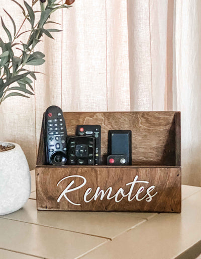 Keep your remotes neatly organized and easy to find with our handcrafted wooden caddy. Stained to your color preference and finished with dimensional 3D lettering in white or black, it adds both function and charm to your space. With plenty of room for remotes—or other everyday essentials—this caddy is as versatile as it is eye-catching.
