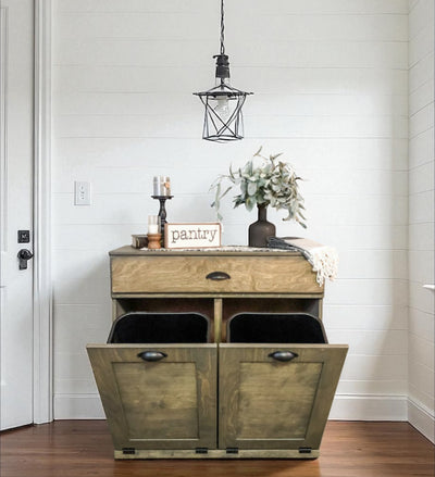 Amplify your home's functionality and style with this tilt-out trash cabinet plus a storage drawer.