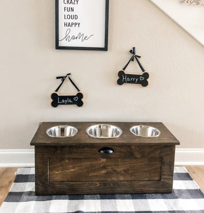 3 bowl elevated dog feeder with storage drawer in dark brown stain