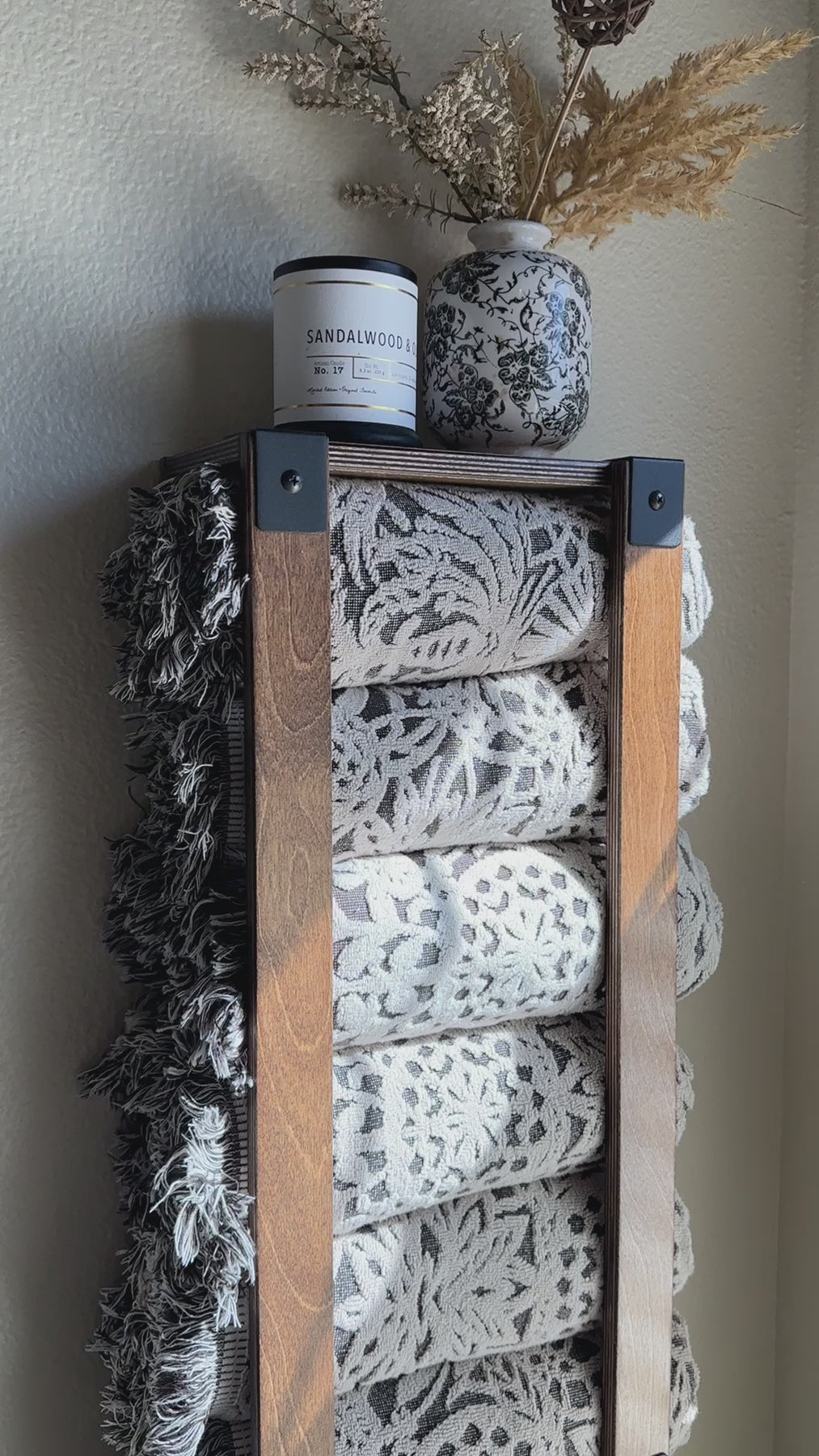 Providing effortlessly storage without taking up too much space, our earthy stained wooden towel racks with black caps are a versatile addition to any décor, from classic farmhouse to boho-inspired. This is for one rack