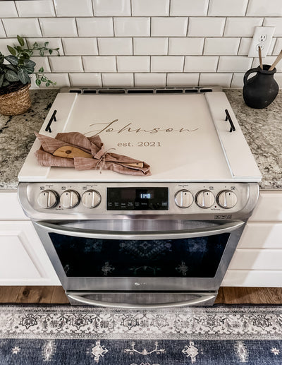 A clean, tidy look for your kitchen while still offering personalization. The perfect newlywed, anniversary, or new home gift! Our stove covers offer extra kitchen space with a personal touch.