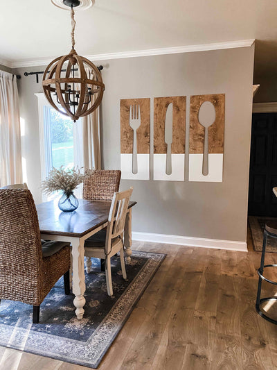 Have you been searching for the perfect wall hanging for your dining room or kitchen? Our fork, spoon and knife are the perfect combinations to add a little fun and a lot of design flair! Choose your size and your combination!