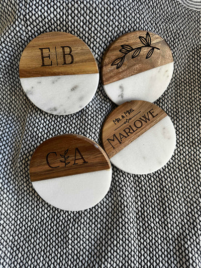 Coasters are a necessity for every home. Yours should reflect your style. Our wood and white coasters can be engraved to do just that. We offer 4 different designs and a matching cutting board (sold separately).