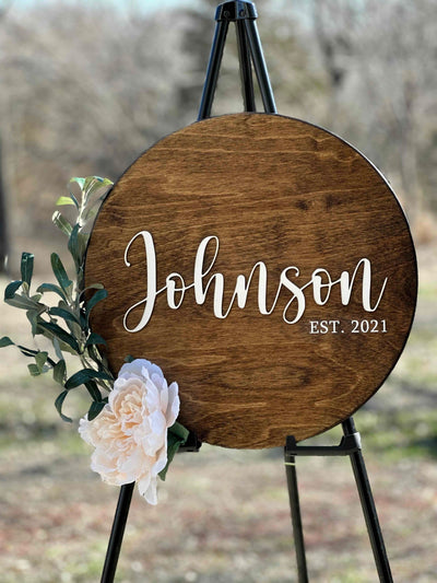 Our gorgeous handmade last name sign is the perfect wedding or anniversary gift. The last name is prominently displayed in 3-d while the established date is laser engraved and the inset is hand painted. Measures 20 inches and comes ready to hang.