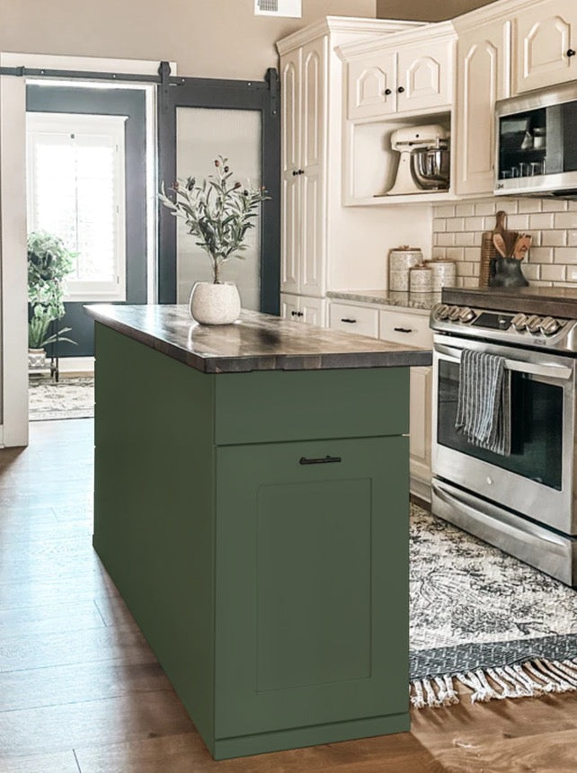 Our beautiful islands are the perfect combination of clean lines, beauty, and functionality. This island pairs a solid, thick butcher block top together with a functional kitchen tilt-out trash and cabinet to lend a traditional look that blends effortless style into any aesthetic.
