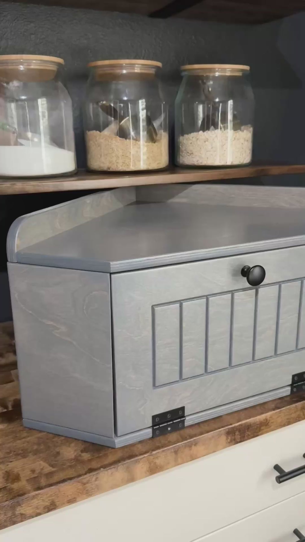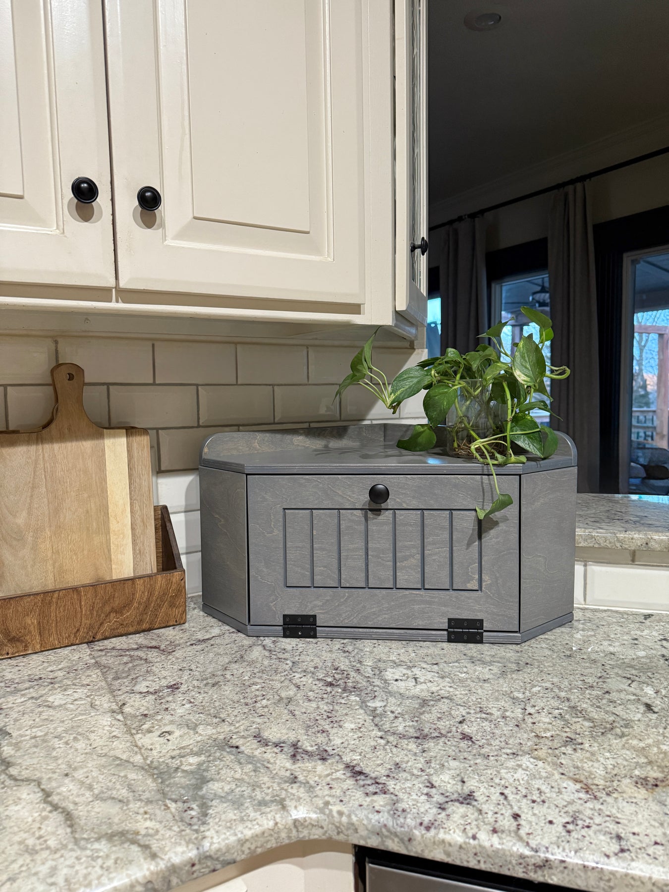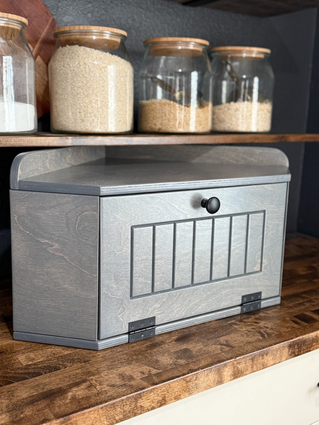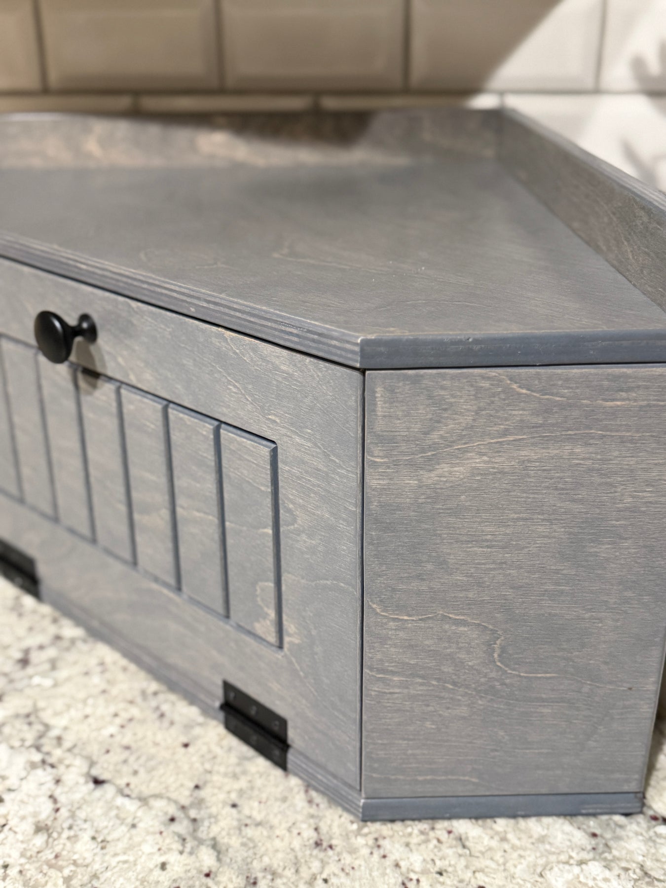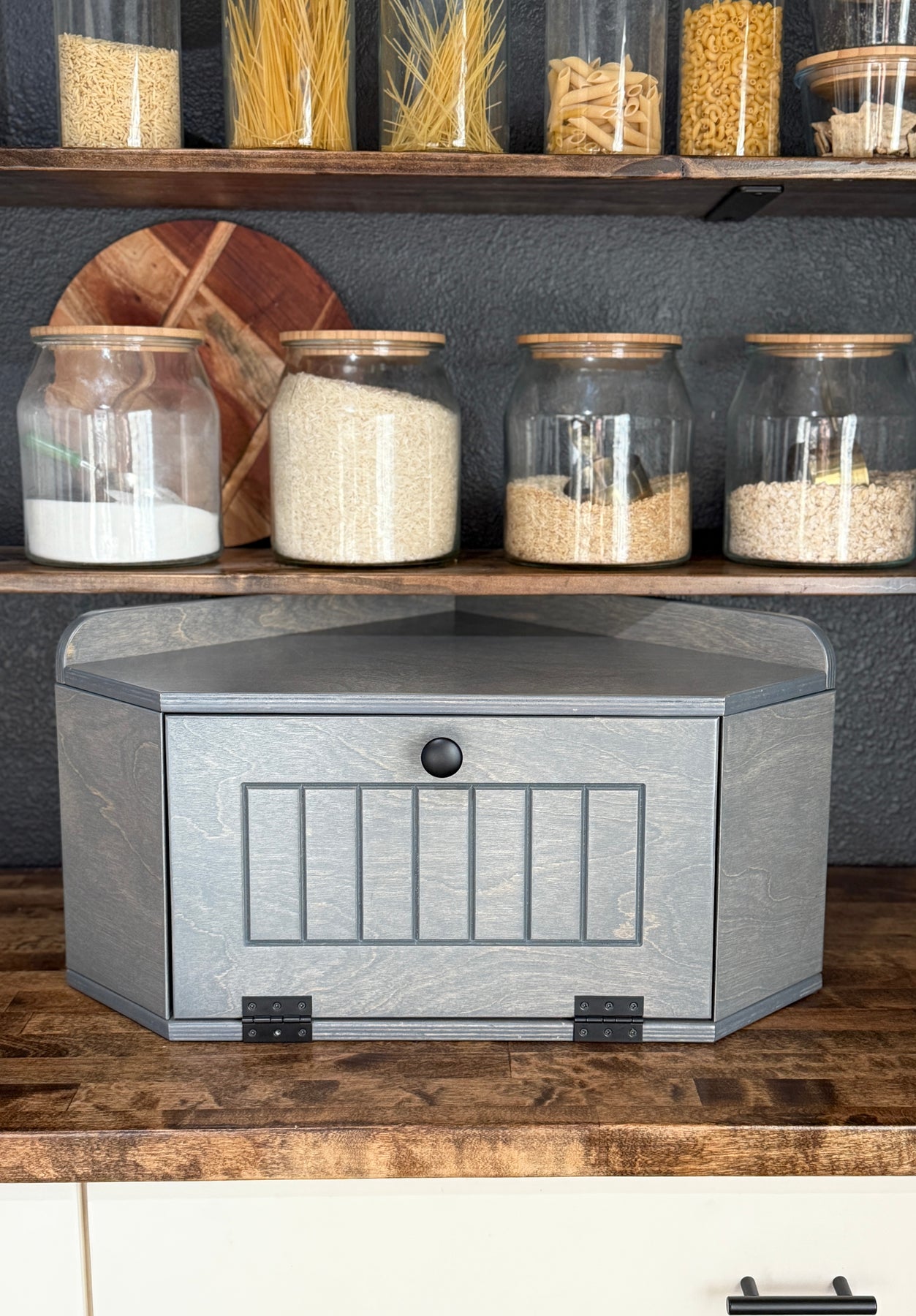 The Bread Box is a functional and decorative container with a corner design, offering ample storage to declutter your counters! The low profile allows you to utilize the top surface while also hiding items behind the drop-down door that uses a magnetic tab closure.