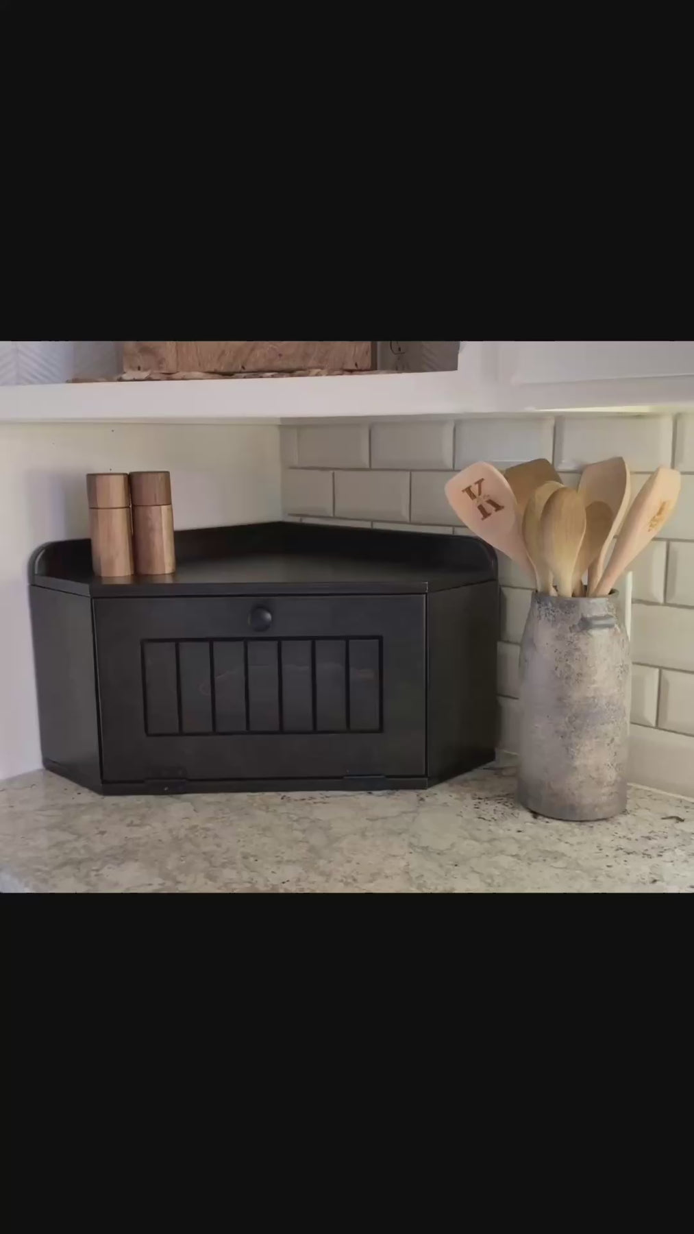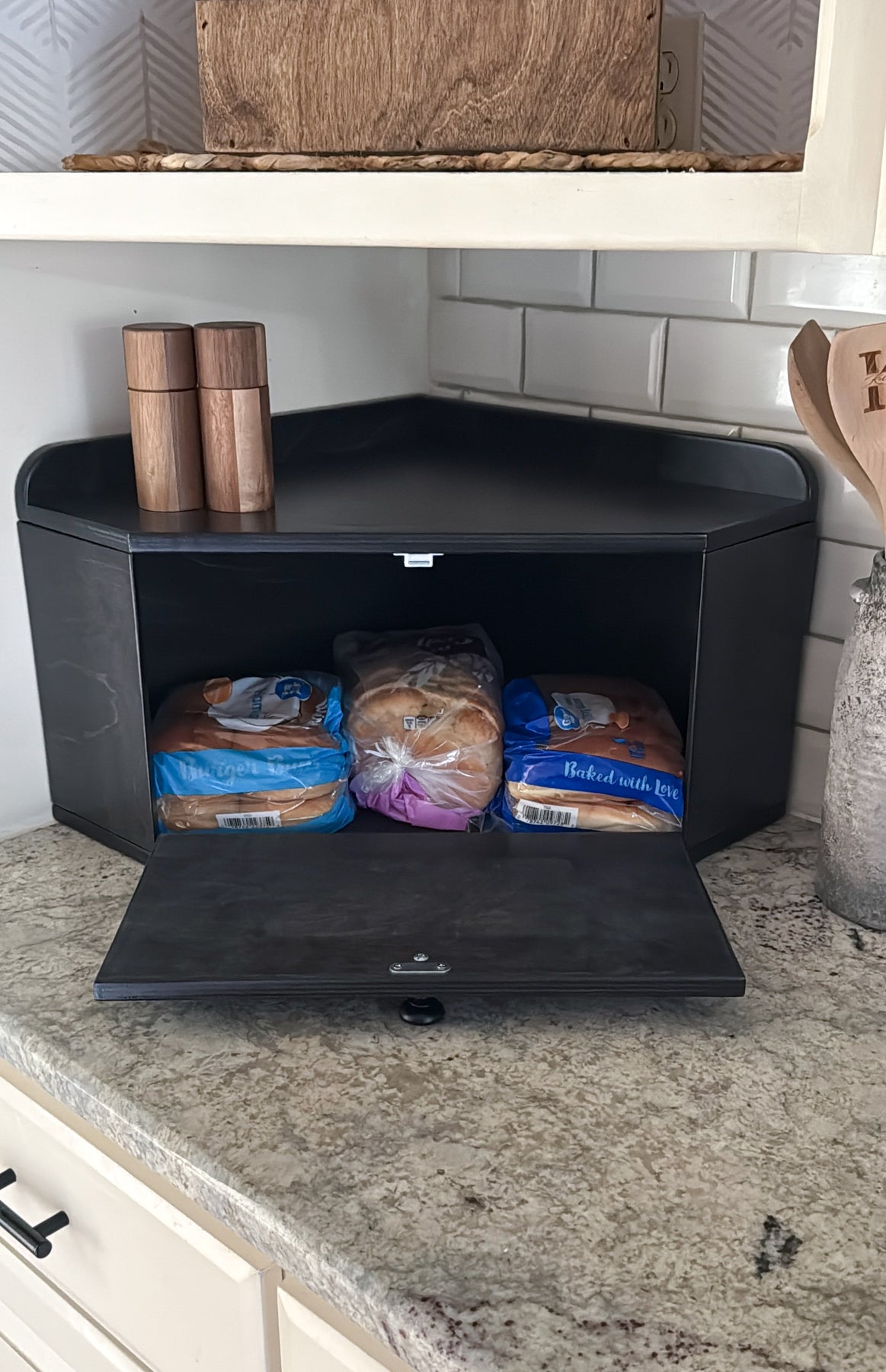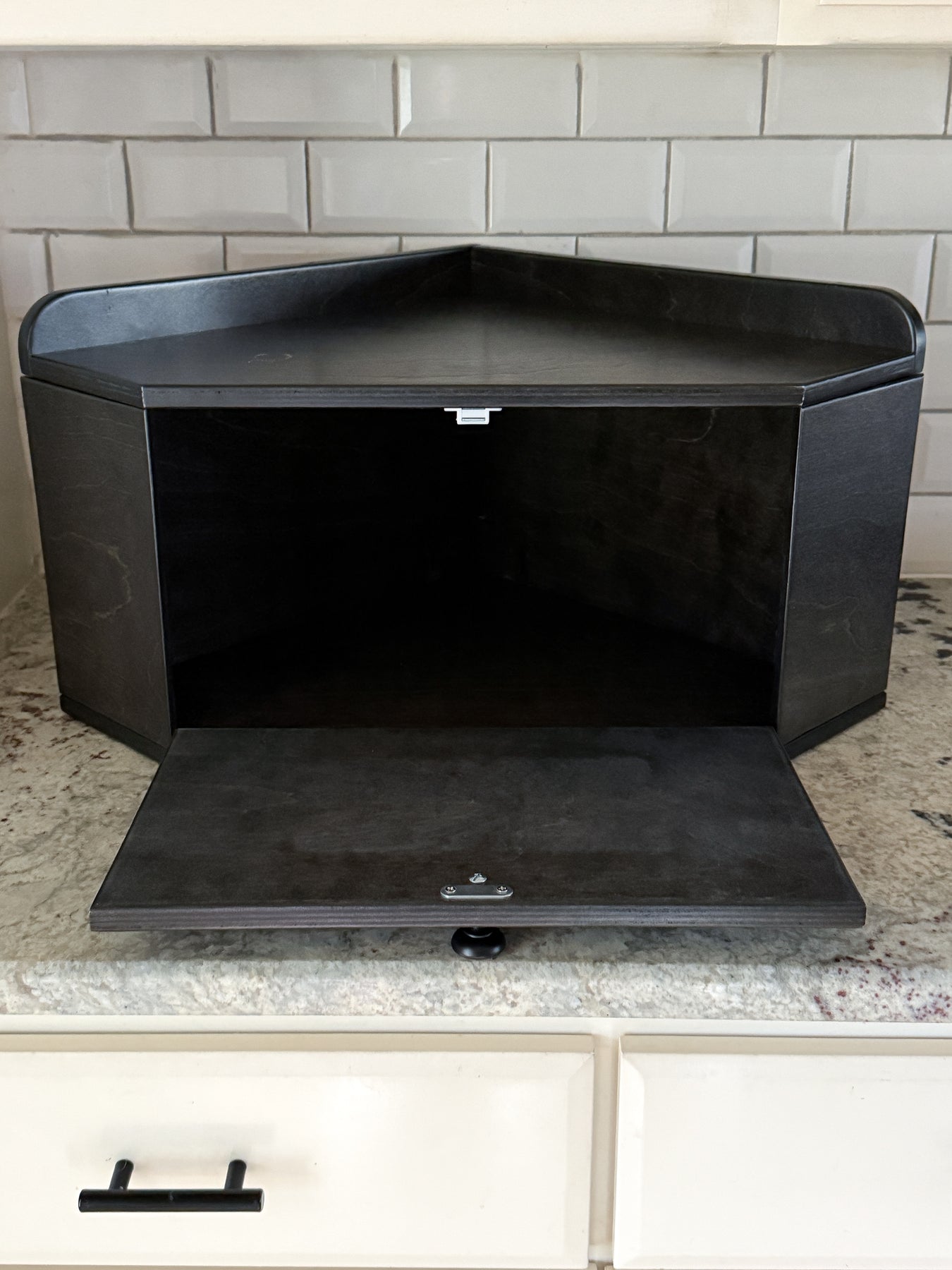 The Bread Box is a functional and decorative container with a corner design, offering ample storage to declutter your counters! The low profile allows you to utilize the top surface while also hiding items behind the drop-down door that uses a magnetic tab closure.
