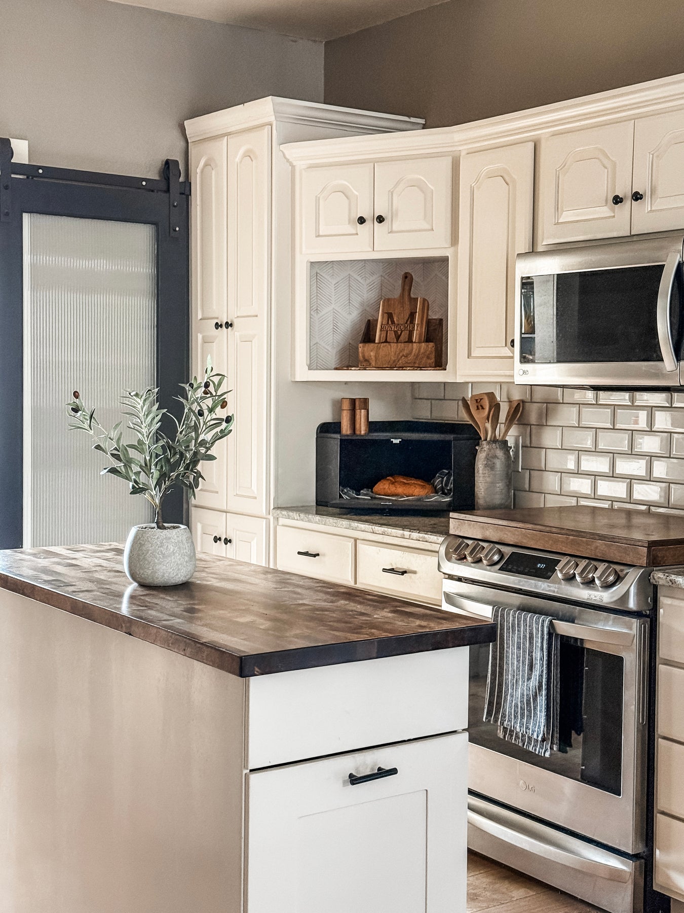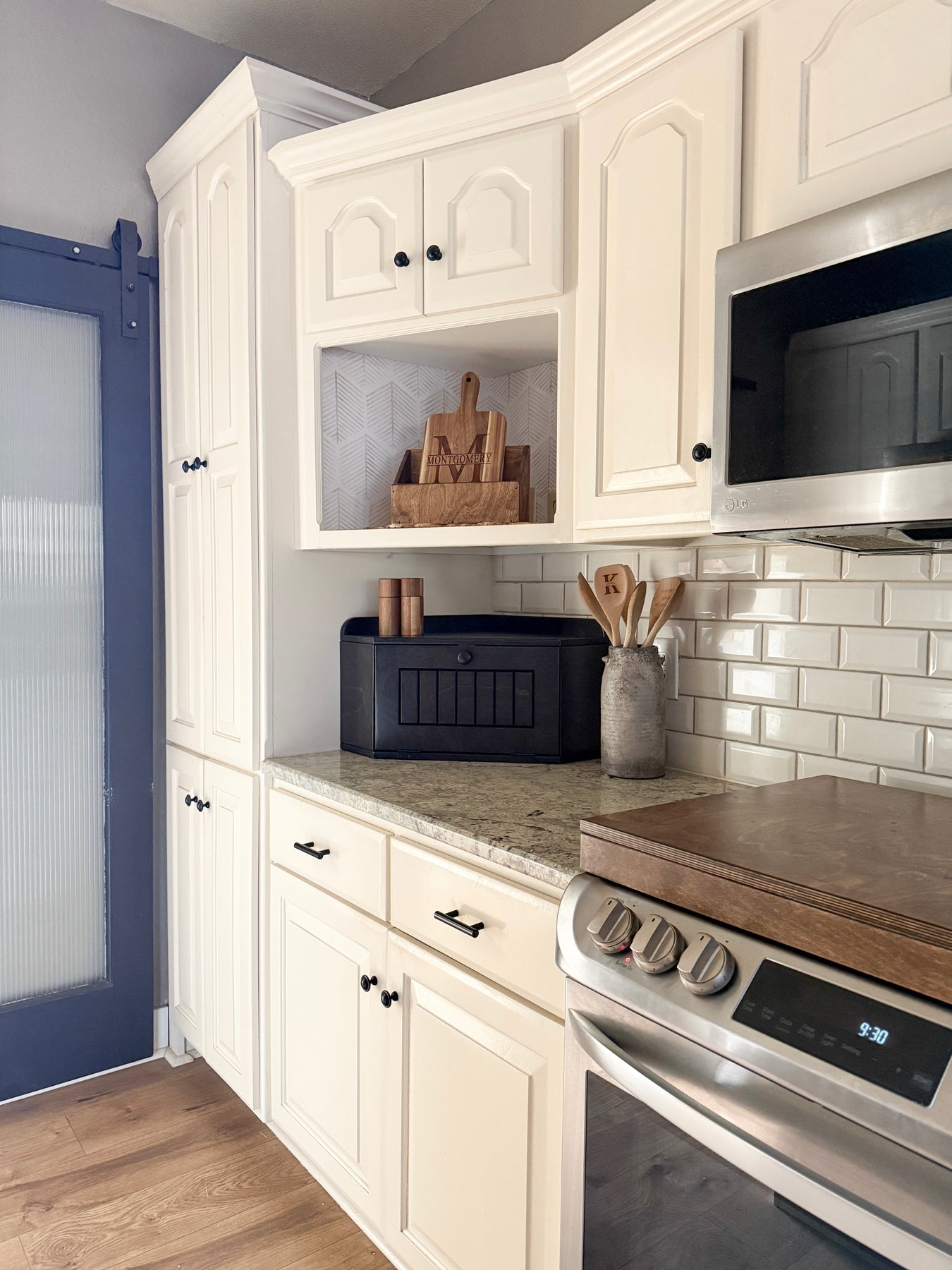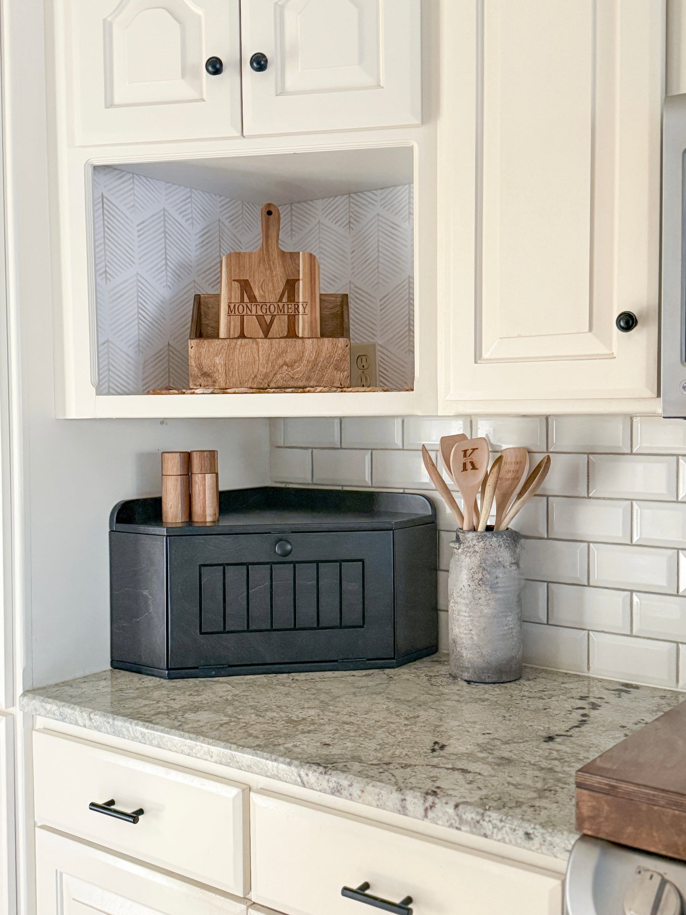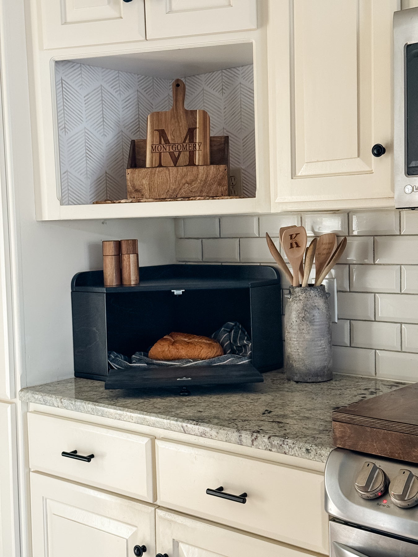 The Bread Box is a functional and decorative container with a corner design, offering ample storage to declutter your counters! The low profile allows you to utilize the top surface while also hiding items behind the drop-down door that uses a magnetic tab closure.