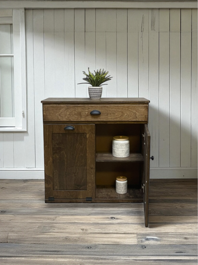 Amplify your home's functionality and style with this tilt-out trash cabinet plus a storage drawer and hidden shelving.