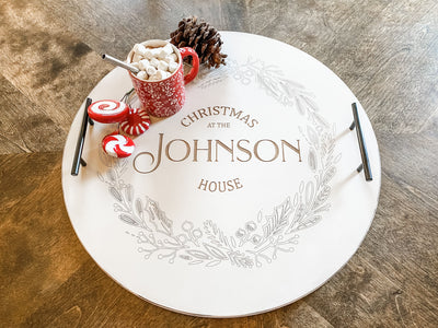 Round Christmas ottoman serving tray in white distressed ~ personalized