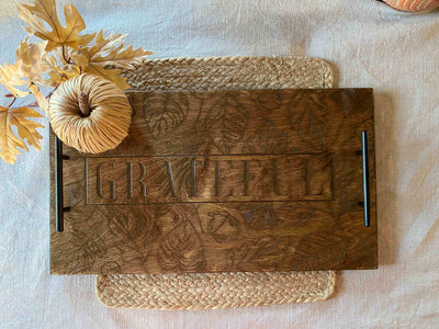 Share your thankful spirit with friends and family this year! The Thankful motif adds the right amount of rustic charm to your home. You also have the choice of Blessed and Grateful. With so many ways to use this tray, the toughest decision is which handle you like best.