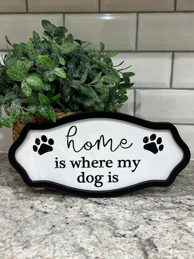 Bring a cheerful touch to your home with this adorable sign. Featuring a distressed pawprint design with the words "Home is where my dog is" in bold black font, this sign will add a playful and heartwarming touch to any room. The black frame and white background make it easy to fit into any decor, and it comes ready to hang with a sawtooth hanger.