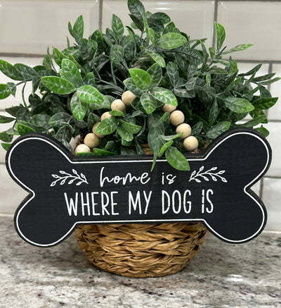 Add a charming touch to your home with this "Home is where my dog is" wooden sign. This sign has a distressed black paint finish with white lettering, complete with a jute rope hanger and natural wood beads. It is the perfect addition for any pet lover.