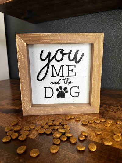 The You Me and the Dog Shadowbox Frame boasts a speckled white background, an unpainted wooden frame, and a playful "you me and the dog" message with a paw print cut-out replacing the "o." It even comes with a pre-installed sawtooth hanger for easy mounting and a flat base for versatile display options on shelves or tabletops.