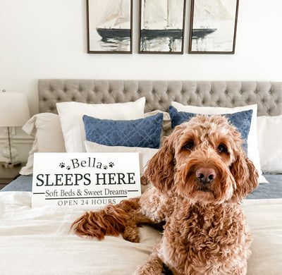 Let your fur baby know they are loved and pampered even while they sleep with this Sleeps Here sign. Handmade and personalized with hand-painted lettering, it adds a cute touch to any pet's sleep spot. (Pet not included)
