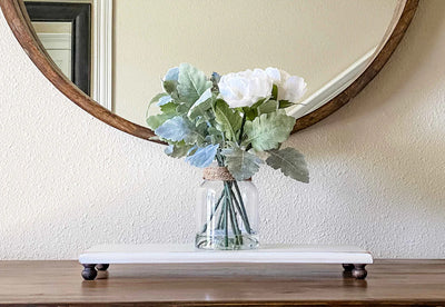 The perfect little stand for any plant or small decor item! Hand-made by us, distressed soft white base with dark brown stained bun feet. The longer length is perfect for elevating your books, candles, or greenery.