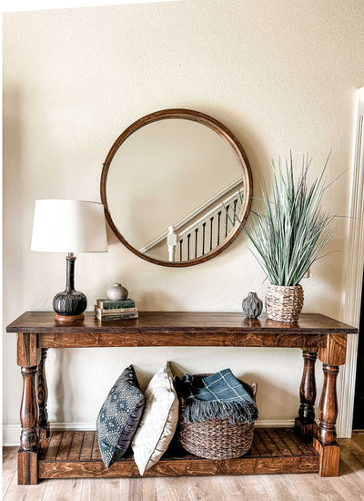 Love your living room! Accent to your space with this farmhouse-style console table. Crafted of solid wood, this console table offers gorgeous, baluster legs made of solid knotty pine and a plank-style tabletop. One open lower plank-style shelf is great for stacking books or storing blankets, while the tabletop provides a perfect platform for framed photos, potted plants, or a stylish pair of lamps. Elegance meets earthy! It is perfect for your entryway, as a sofa table or anywhere you need stylish storage. It is an eye-catching complement to our baluster coffee table and end table. This table works as an entry table, sofa table, or console table.